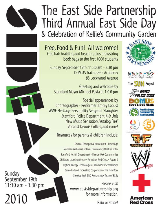 • This Sunday come see us at the third annual East Side Day. Free Food, Fun, Yoga and More! Trailblazers Academy Building, 83 Lockwood Avenue, Stamford, CT